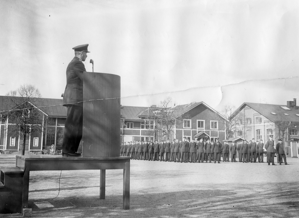 Avtackning av värnpliktiga på kaserngården, A6. Överste Lundqvist.
