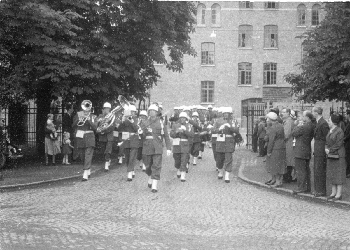 Musikkåren, A 6. Passerar gamla kasernvakten.