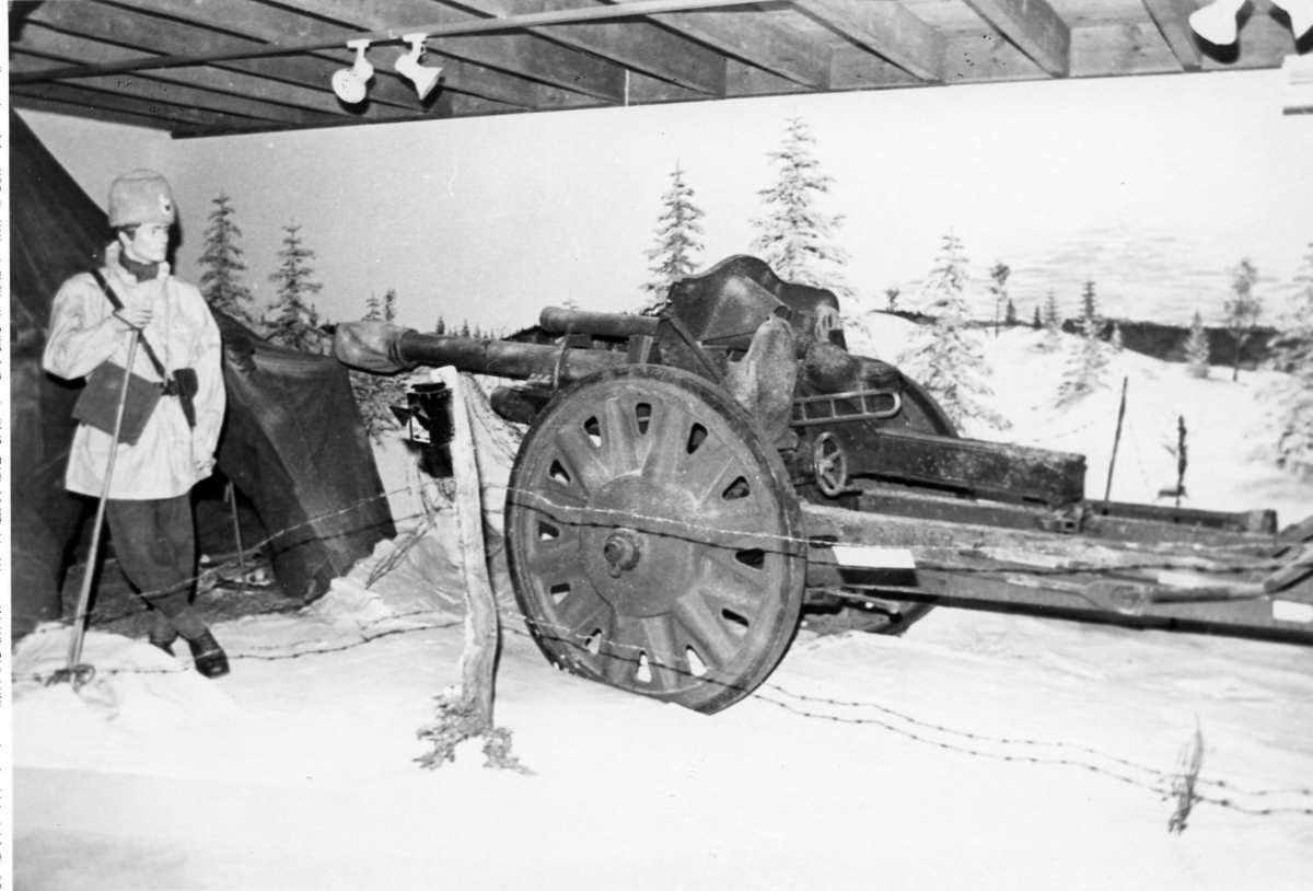 Försvarshistoriska muséet, Jkpg. Haubits m/1939. 10,5 cm. Vintermiljö.