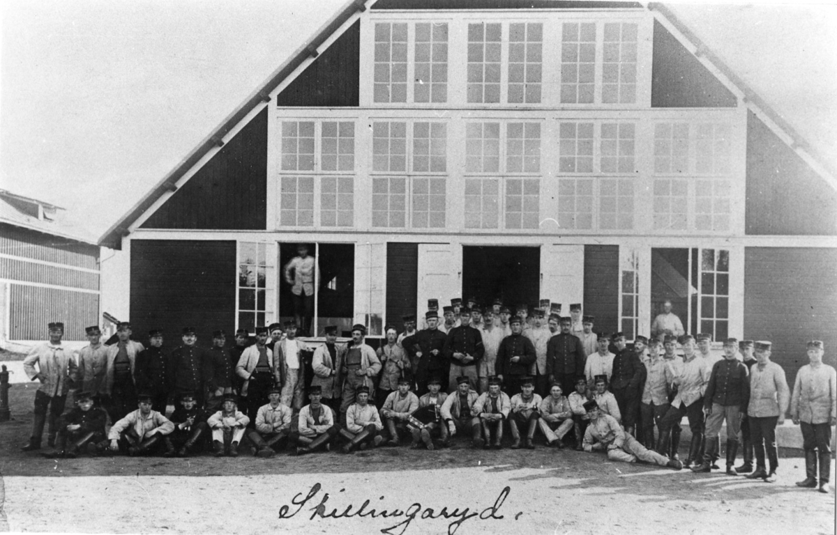 Soldater framför lägerhyddan, i Skillingaryd. Östra lägret.