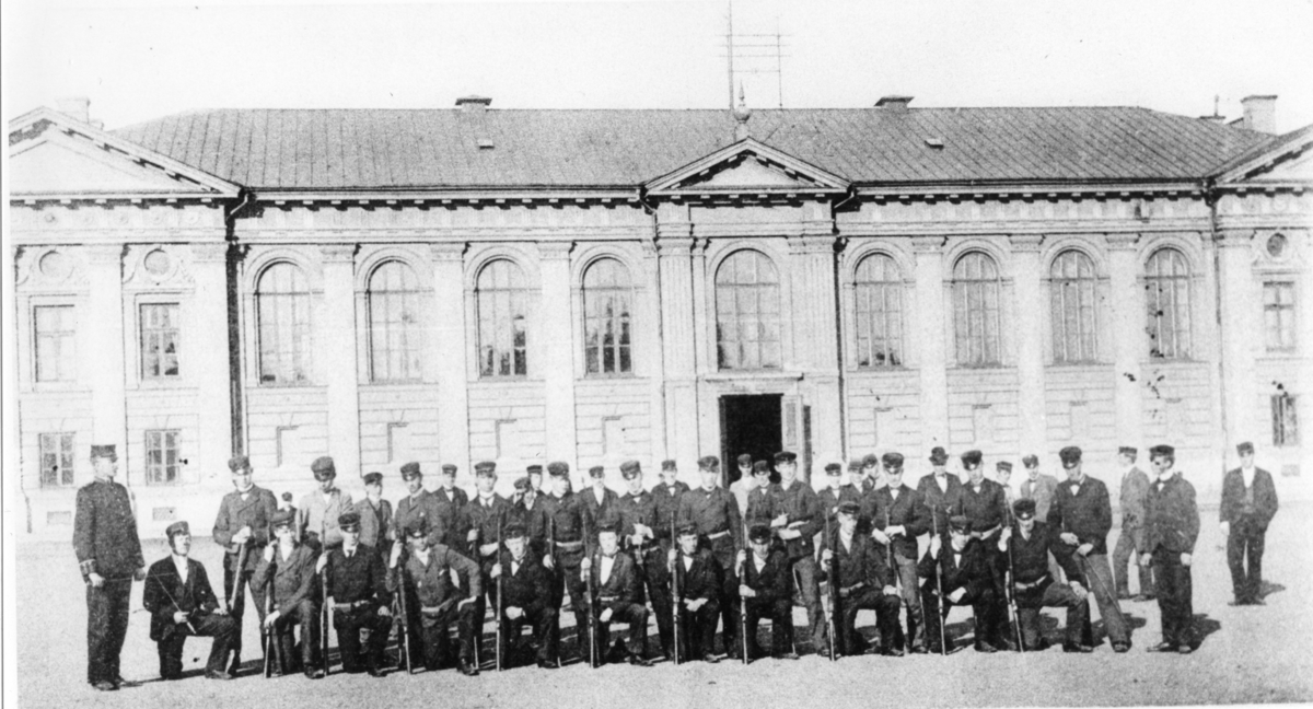 Skarpskyttar, utanför läroverkets gymnastiksal. A 6.