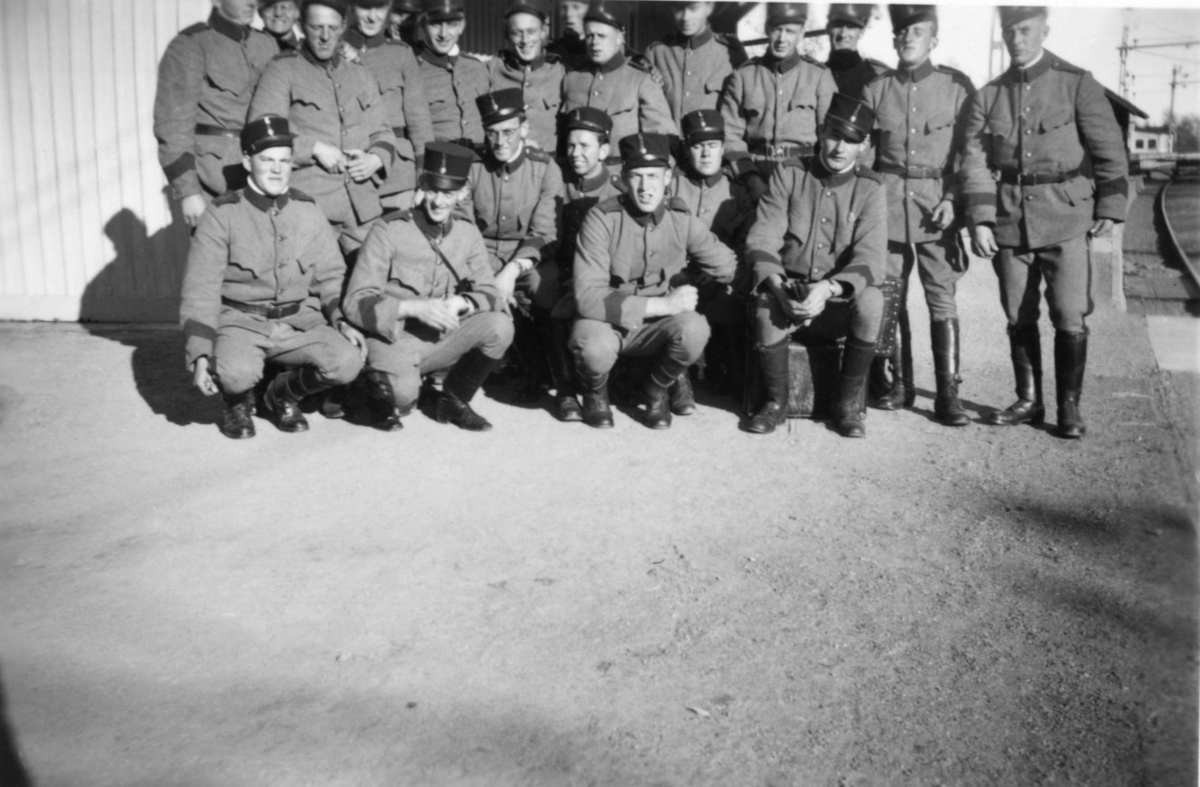 Titel: Värnpliktiga på en järnvägsstation.