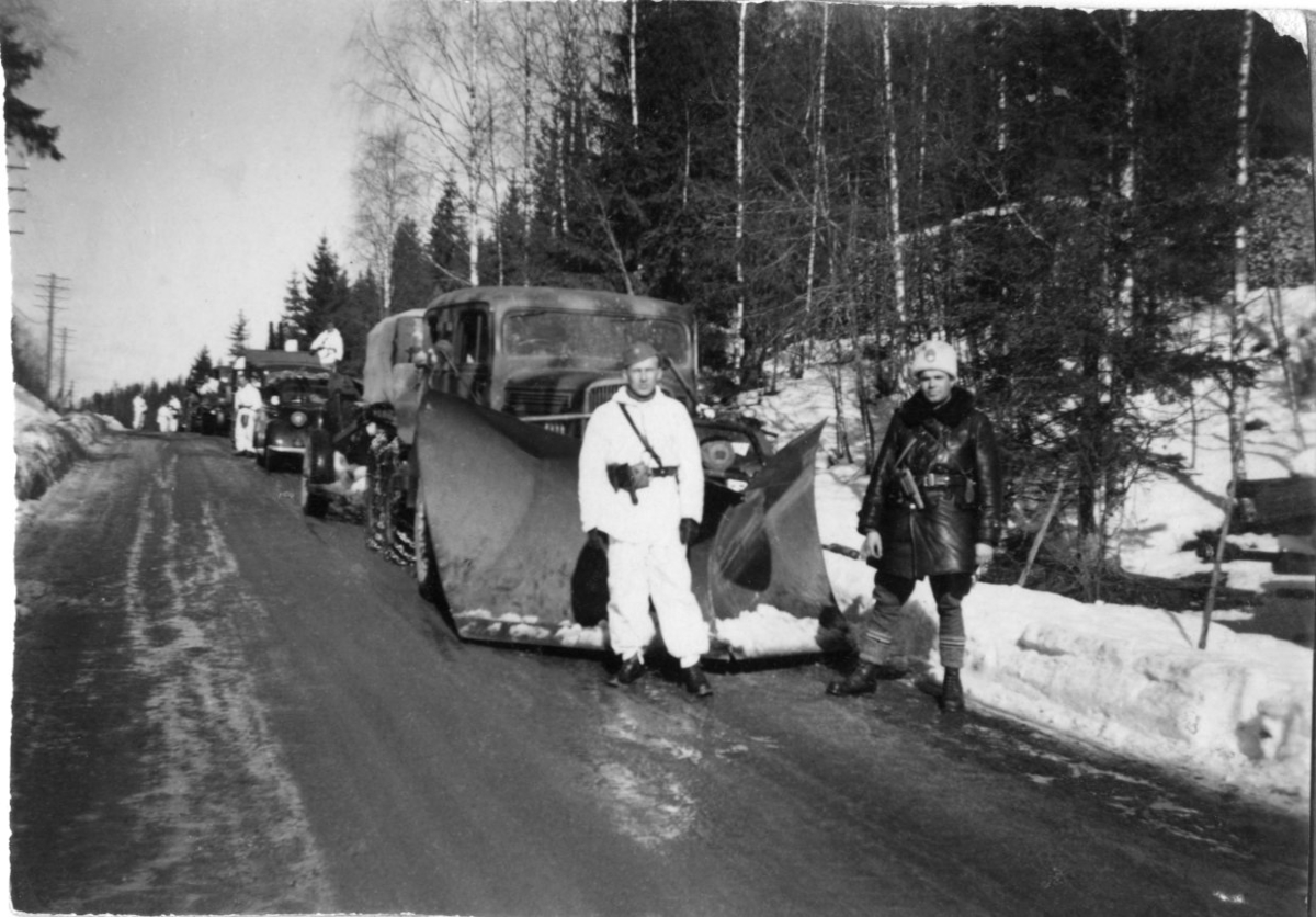 Fordonskolonn, Värmland. Sergeant Asp i skinnrock.