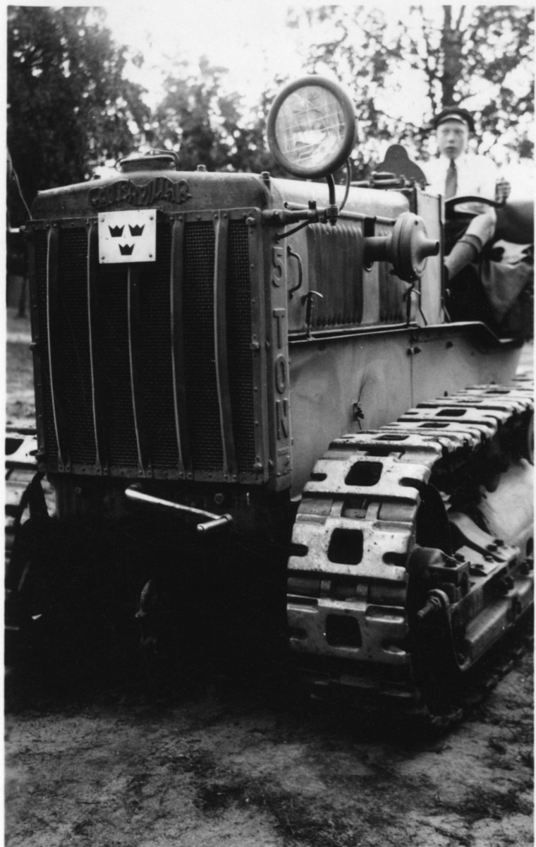 Traktor, Caterpillar, 5 ton. Sergeant Erik Persson på traktorn.