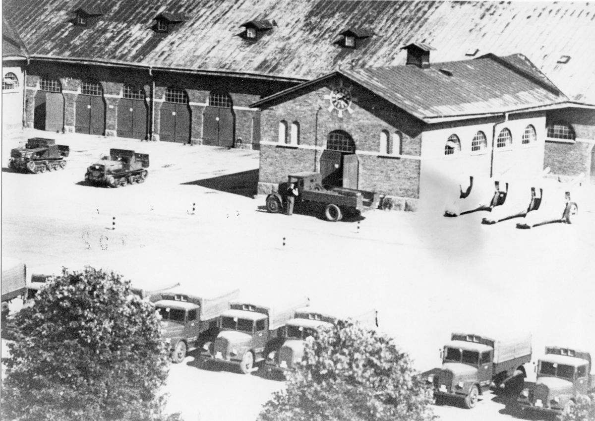 Lastbilar framför Klockgaraget, A 6. Landsverkstrak. upp till vänster.