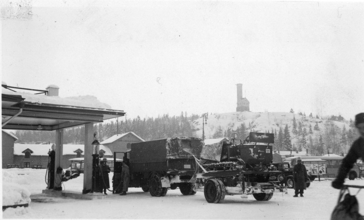 Lastbil med upplastad bandtraktor på släp. Beredskap, vinter.