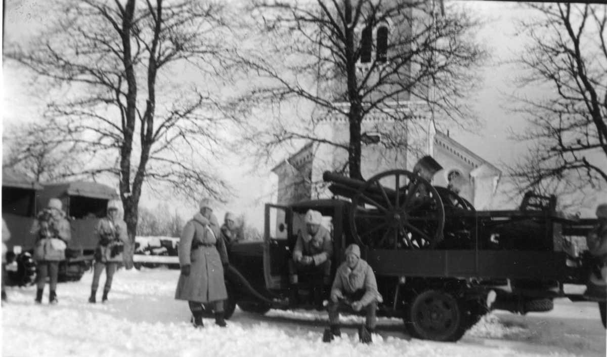 Lastbil, med upplastad kanon m/1902, 7,5 cm, A 6. Vinterövning.
