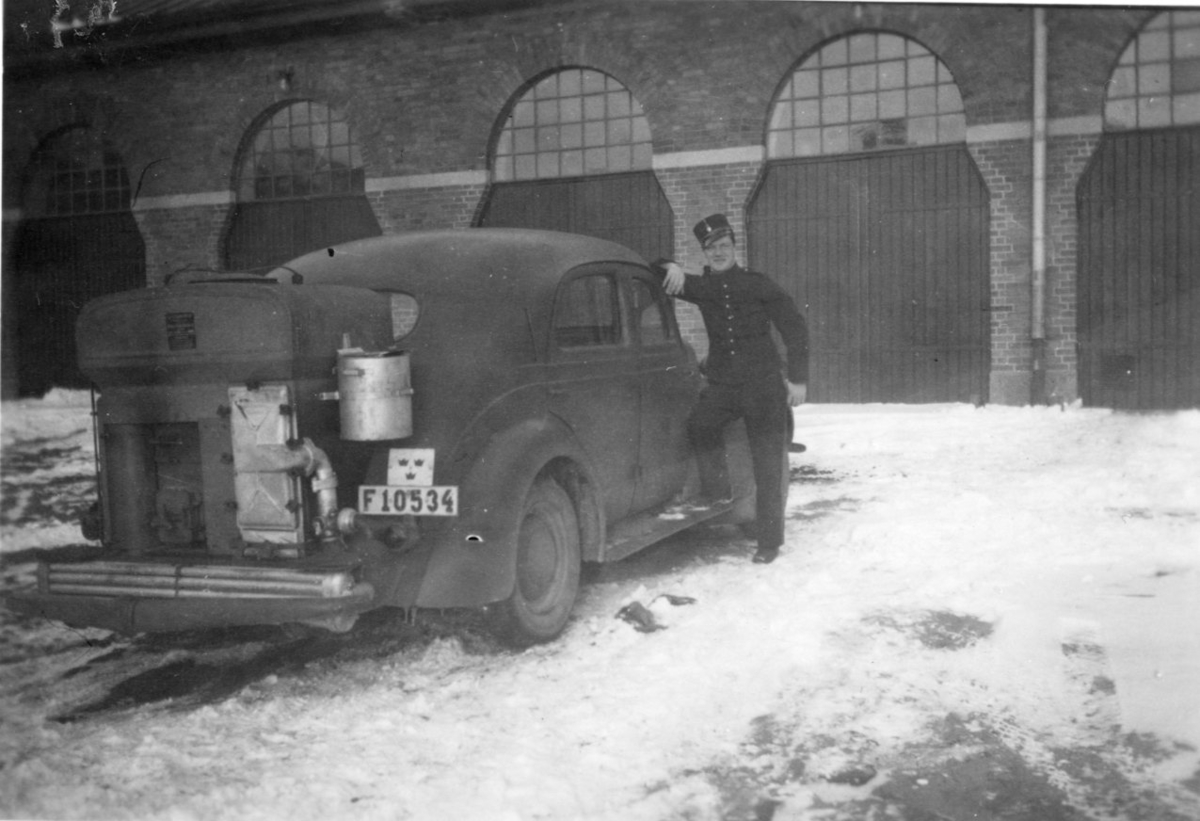 Volvo, personbil med gengasaggregat. A 6, framför klockgaraget.