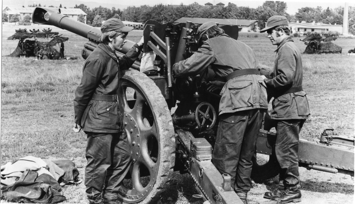 Haubits m/1940. 10,5 cm. Riktövning.
