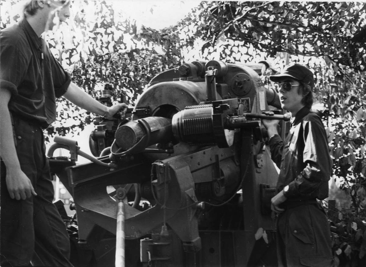 Haubits F. 15,5 cm. Mekanism öppen. A 6. Artilleribefälsför. förevisar.