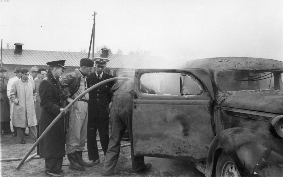 Brandövning, med brinnande amerikansk personbil. A 6. Bil från 30-talet.