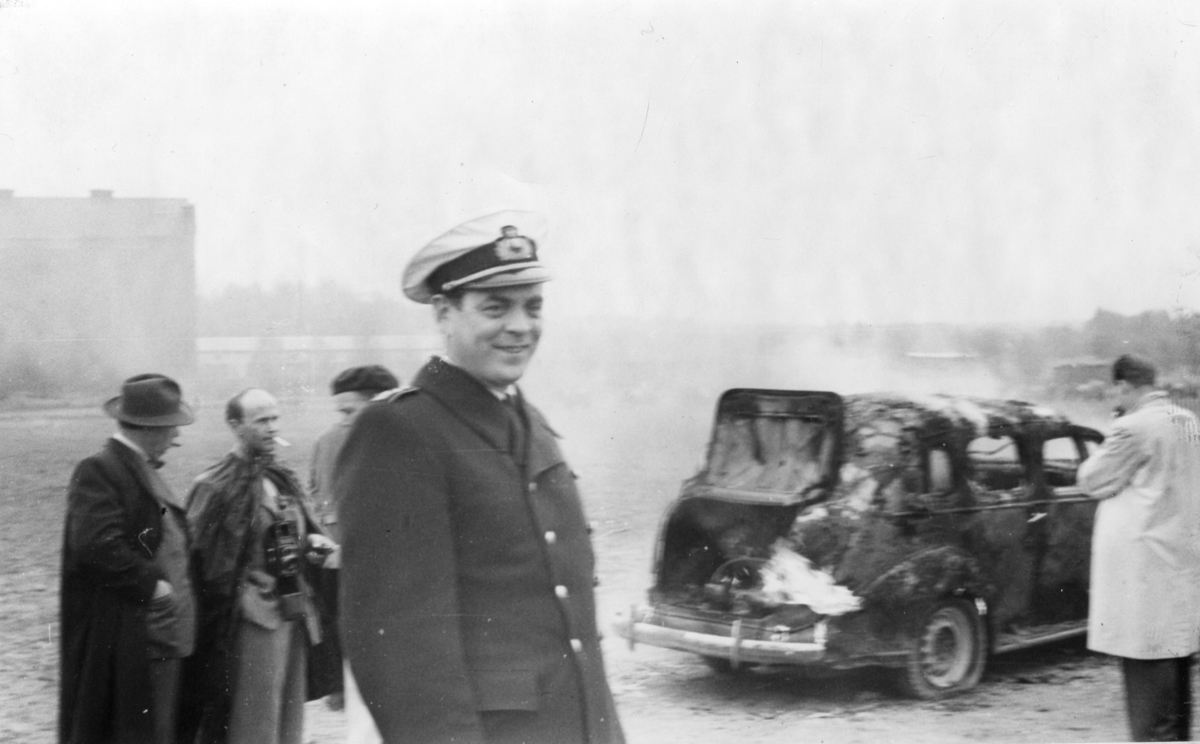 Brandövning, med brinnande amerikansk personbil. A 6. Bil från 30-talet.