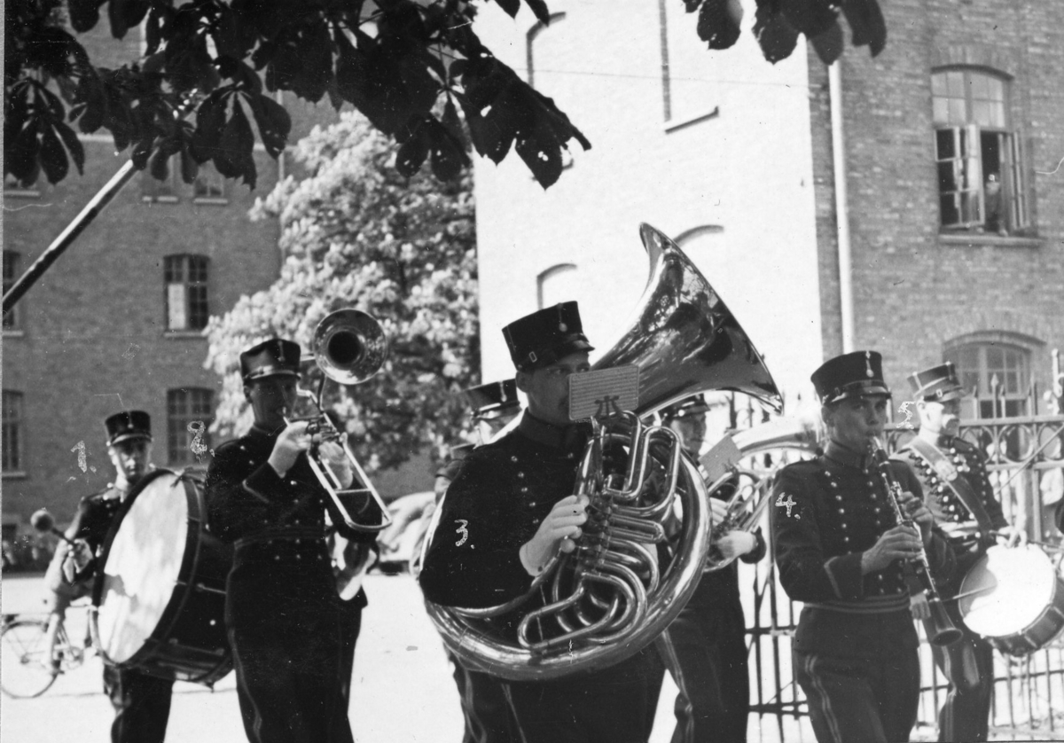 Jubileum 50 års, A 6. Musikkåren lämnar kasernvakten.