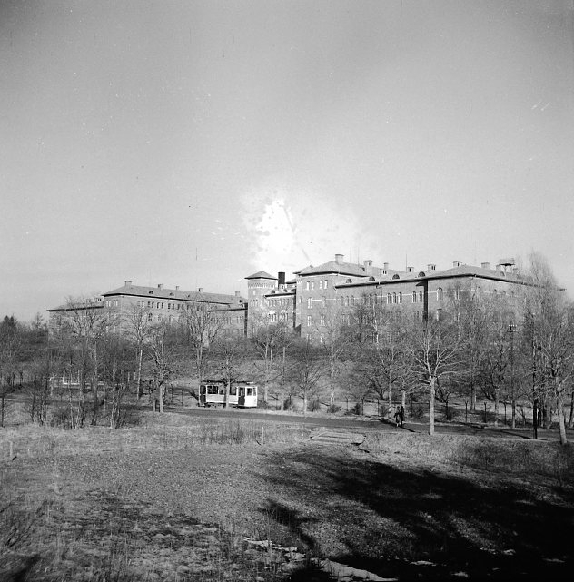 Titel: Kasern A 6. Spårvagn i förgrunden.