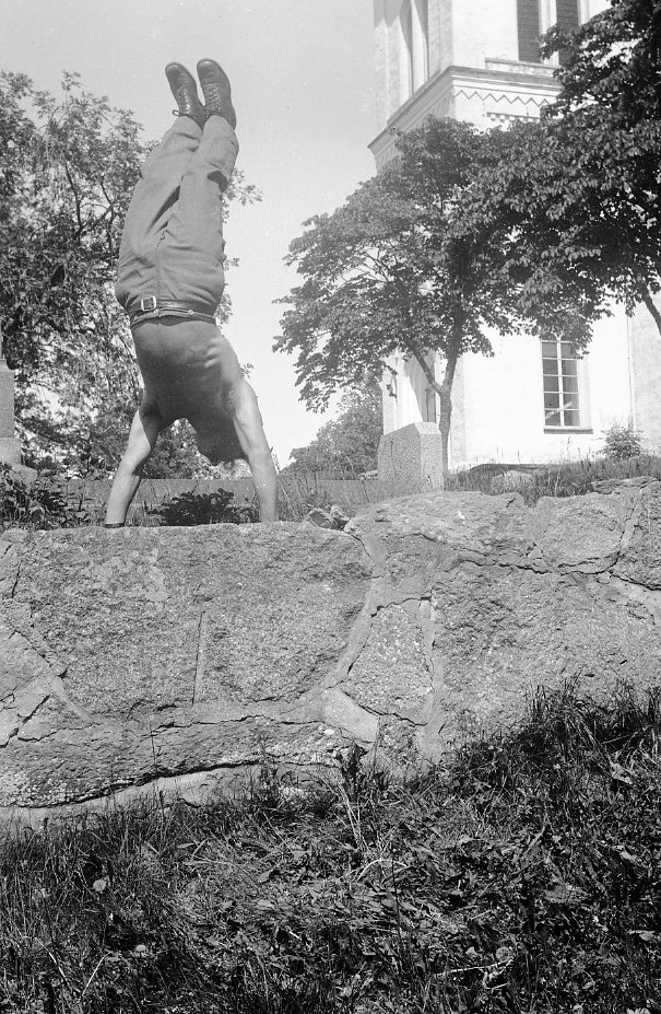 Handstående värnpliktig på kyrkogårdsmur. Järstorp.