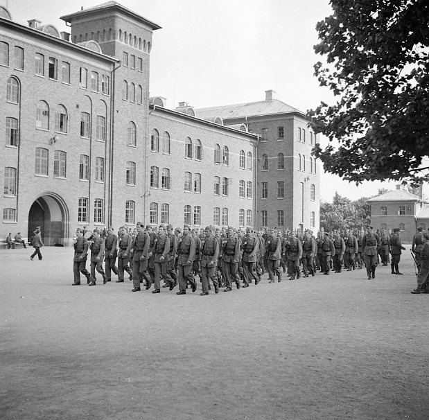 Titel: Värnpliktiga marscherar på kaserngården.