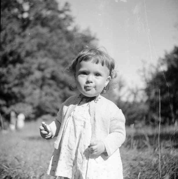 Flicka, ca 2 år i gröngräset.