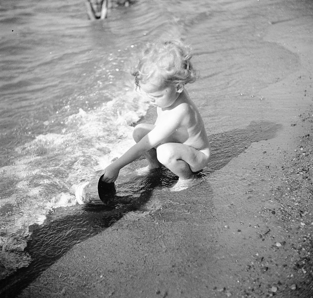 Badande barn med hink och spade.