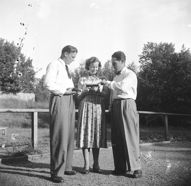 Titel: Pistolskjutning. Tre vuxna. Erik Sandstedt till höger.