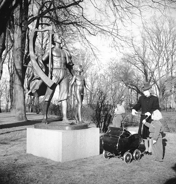 Kvinna med två barn vid Harpospelaren i Rådhusparken.