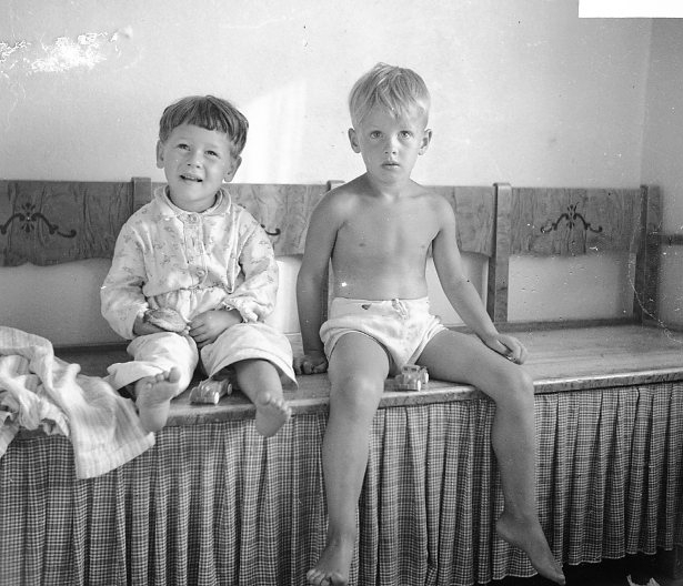 Barn (2) som sitter på en soffa.