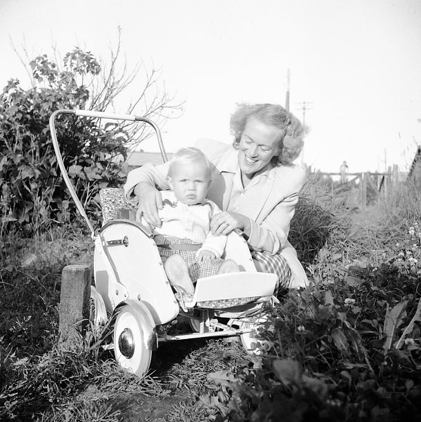 Kvinna med barn i barnvagn.