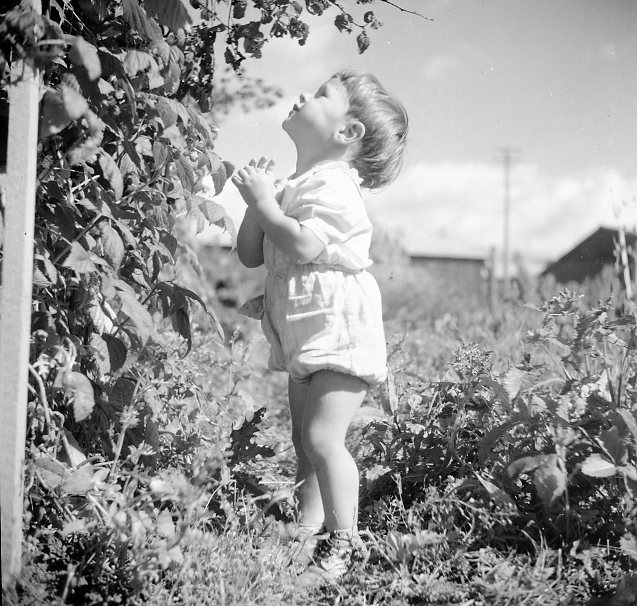 Barn som står vid en häck.