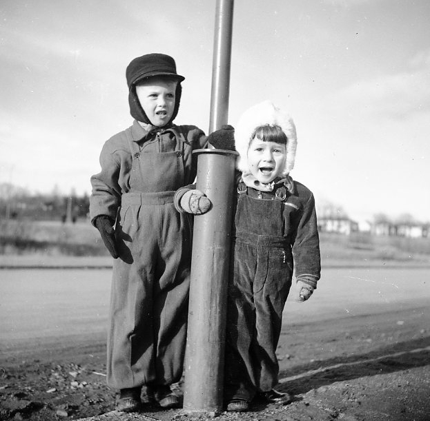 Barn som står vid en lyktstople.