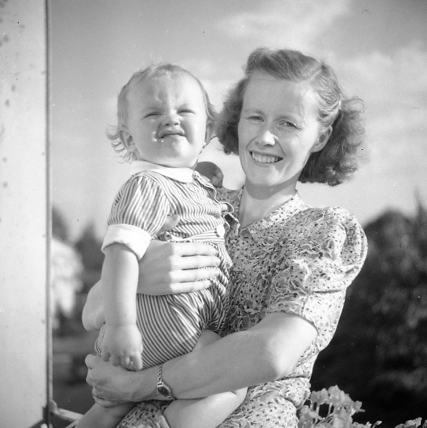 Kvinna med barn på en balkong.