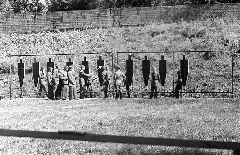 Titel: Modern Femkamp, duellskjutning. A 6 pistolskjutningsbana.