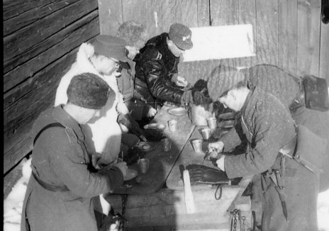 Utspisning, löjtnant Jung i päls.