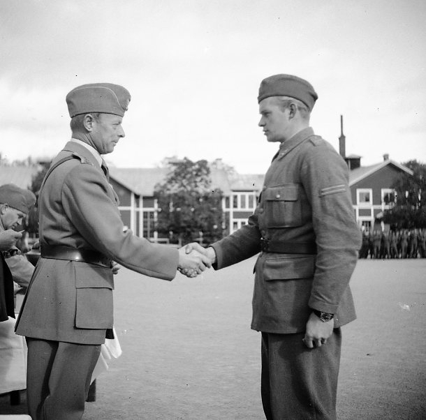 Värnpliktig konstapel mottager pris av överste Årmann.