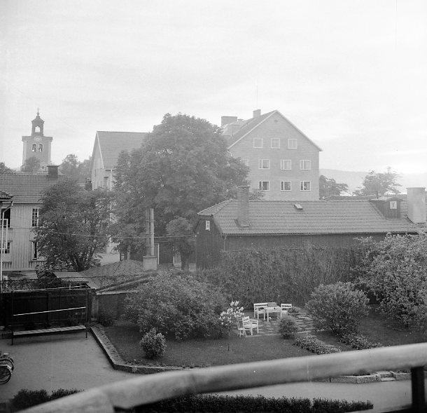 Östra city från balkong. Kristine kyrka i bakgrunden. Mot väster.
