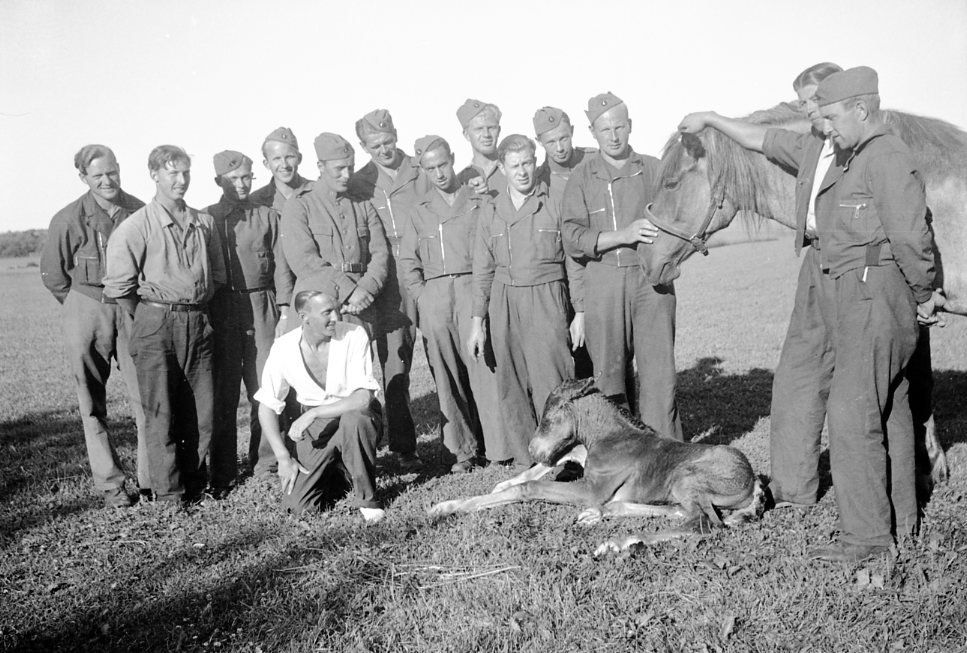 Titel: Värnpliktiga vid en nyfödd fölunge.