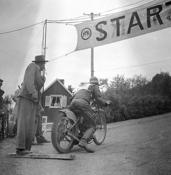 Motorcykeltävling. Starten. Backtävling i Klevaliden, Huskvarna?