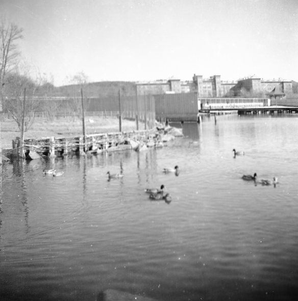 Rocksjön, badplatsen. A 6 kasern i bakgrunden.