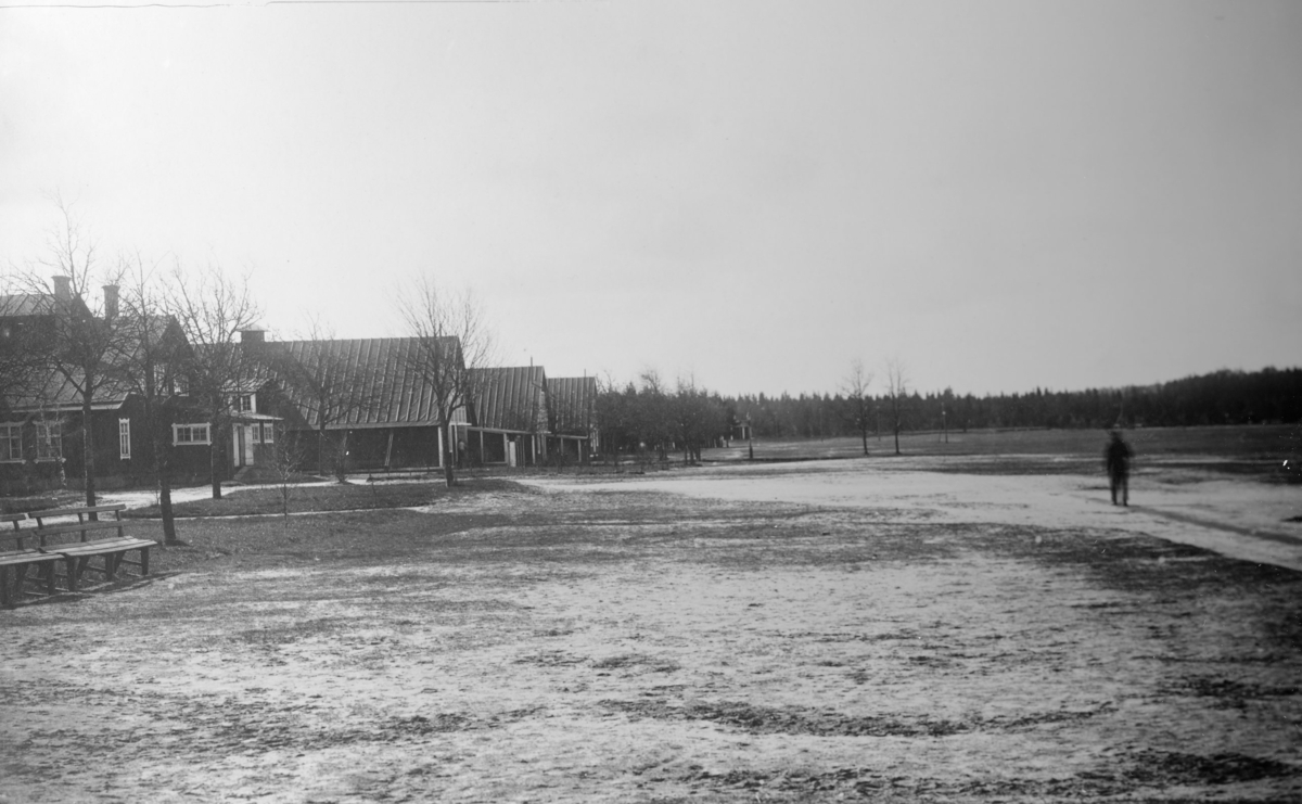 Titel: Lägerplatsen med lägerhyddorna. Bilden taget mot söder.