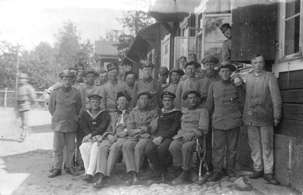 Vaktmanskap och internerade tyska Albatrossmän, utanför Södra Lägerbaracken. I bakgrunden skymtar Sjukhuset (nuvarande skjutfältsexpeditionen) och en del nätstängslet runt interneringsområdet.