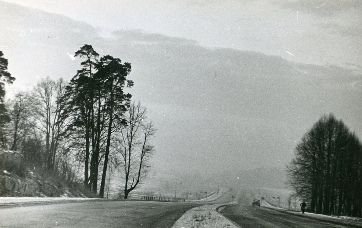 Frösunda backe i morgondimma, långt innan Solna stad satte upp belysningsstolpar.