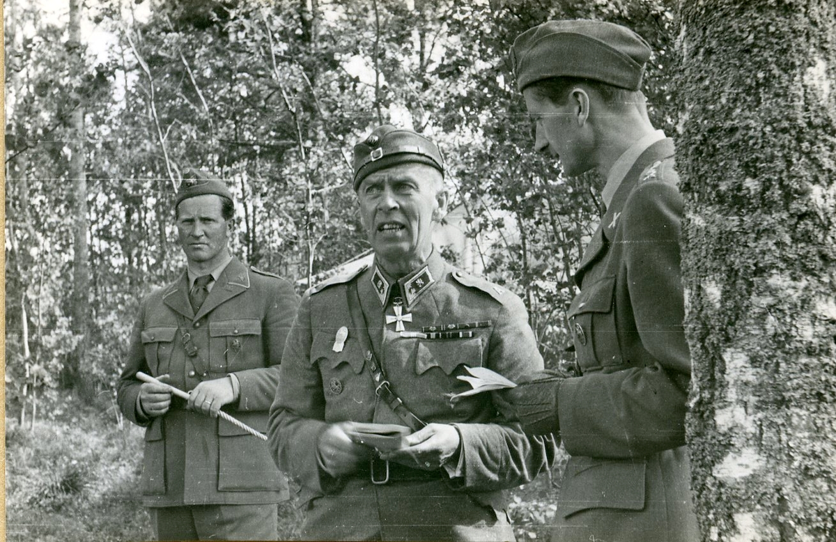 Kapten Malmquist avvaktar samtalet mellan general Ehrnrooth, som var en av de båda tekniska delegaternavid OS i fälttävlan och kapten Mittag-Leffler.