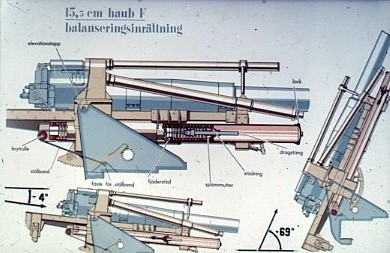 Haubits F. 15,5 cm. Bilder av planscher. Balanseringsinrättning.