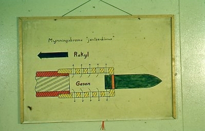Haubits F. 15,5 cm. Bilder av planscher. Mynningsbroms.