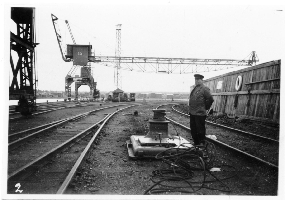 Titel: Maskinell utrustning. Kran över en järnväg.