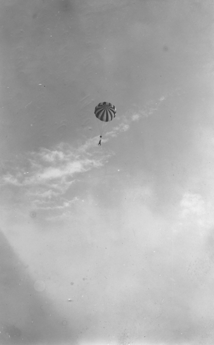 Titel: Major Orde Leeds hopp med fallskärm i Jönköping Midsommardagen 1920.