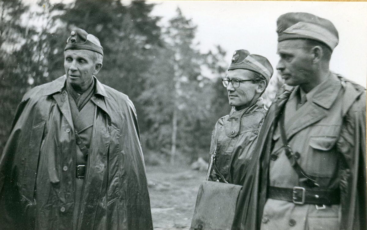 Militärbefälhavaren general Dyrssen i regn och rusk tillsammans med major von Feilitzen och överstelöjtnant Svärd.