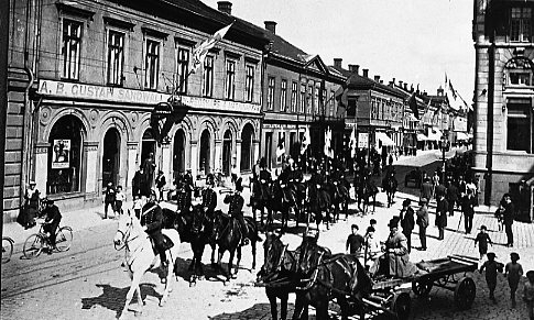 Röda Kors-parad. Ryttare på Ö. Storgatan, Jönköping.