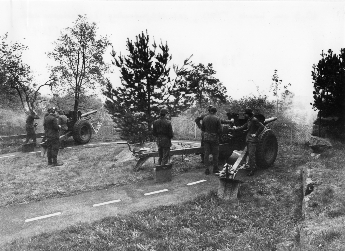 Haubits m/1940. 10,5 cm. Salutskjutning i Stadsparken, Jönköping, 1984. A 6. Platsen är den lilla trafikövningsbanan för barn, där restaurang Alphyddan en gång stått.