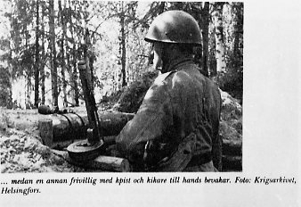 Finlandsfrivillig, med kpist och kikare till hands, bevakar.