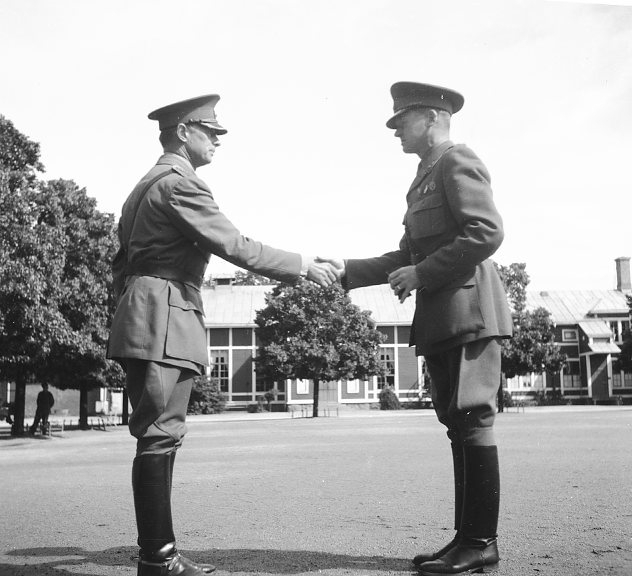 Värnpliktig konstapel mottager pris av överste Årmann.