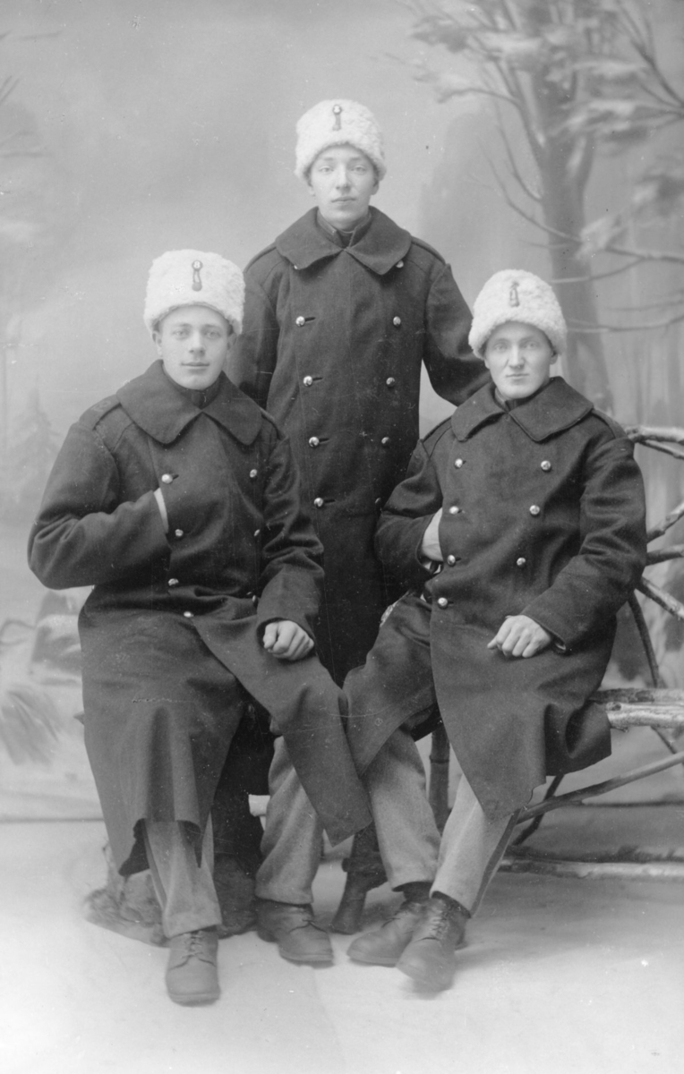 Tre stycken meninga soldater i kappa och pälsmössa. Jönköpings regemente, I 12.